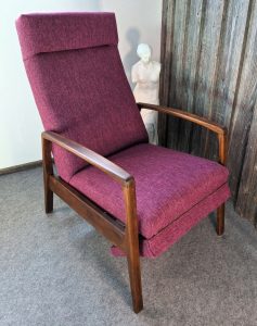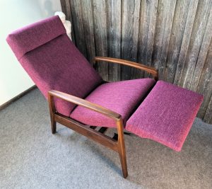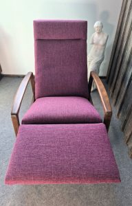 Wenn man sich in diesem Sessel nach hinten drückt, wird er zum Liegestuhl, es kommt eine Fußablage hervor. Dadurch ist er sehr flexibel und natürlich bequem. Der Möbelstoff ist ein Gewebe in kräftigen pink mit etwas Struktur. Die Holzfüße und Armlehnen sind massiv und frisch abgeschliffen, gebeizt und gewachst worden . Eine Kissenhülle ist natürlich auch dabei.