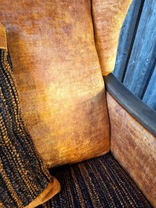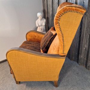 Wie bei Oma und Opa ist dieser Ohrensessel, da kann man ewig drin sitzen. Er ist neu aufgepolstert und neu bezogen. Er ist sehr bequem und hat Holz an den Armlehnen. Der Möbelstoff ist ein sehr weicher Samt im Vintage Style, sowie auf der Sitzfläche ein sehr moderner grob gewebter bunter Möbelstoff. An den Außenseiten ist ein dezent ruhiges, leicht strukturiertes Gewebe. Mit Ziernägel (Hammerschlag). Das Holz ist massiv und frisch abgeschliffen und gewachst worden. Eine Kissenhülle ist natürlich auch mit dabei.